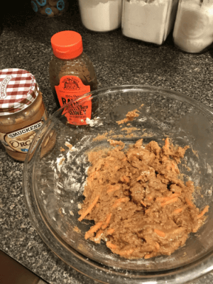 The peanut butter icing (one of Lady’s favorite human foods) is what sold me! It only takes about 45 minutes to complete from start to finish and makes several servings, making it perfect for multiple pups.